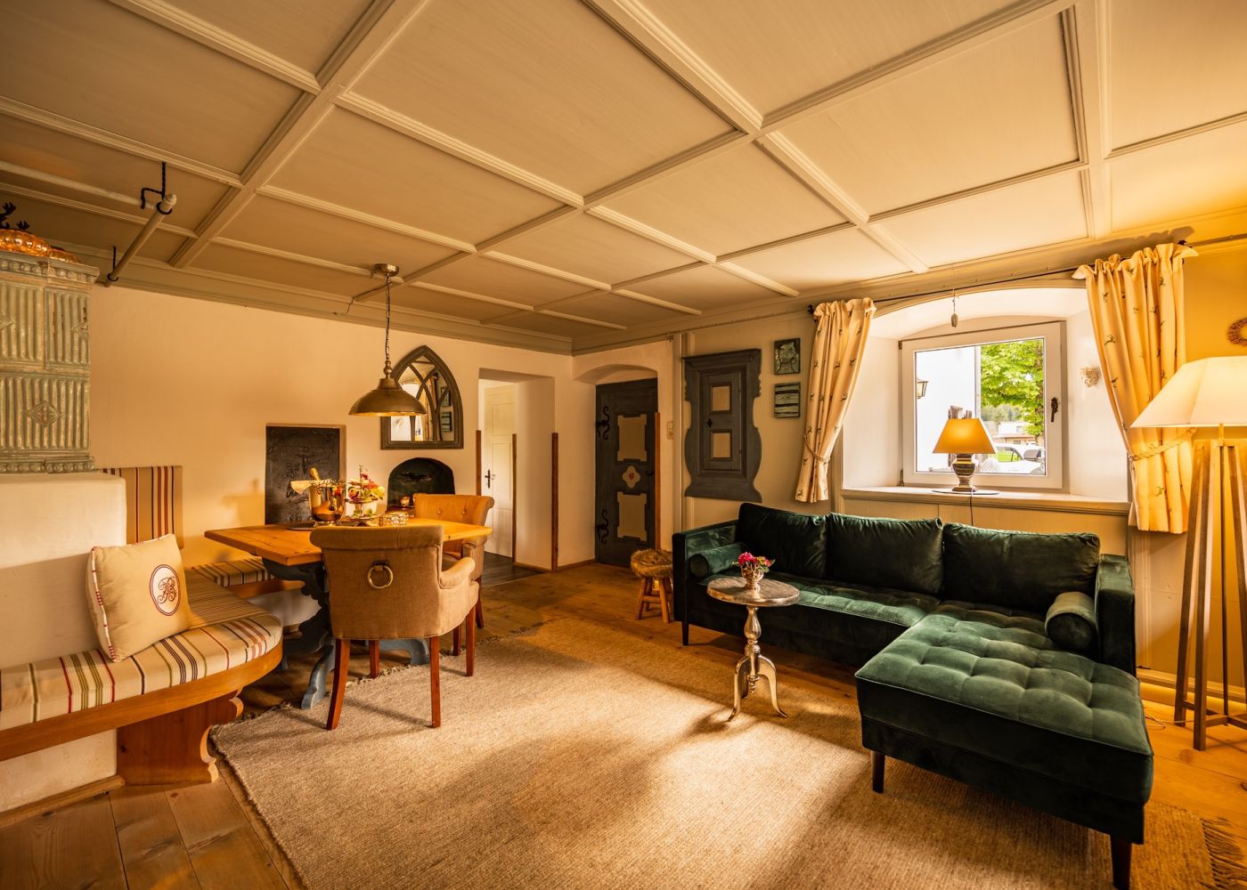 Panoramablick auf das Wettersteinmassiv und die Zugspitze. - Wohnzimmer im Stil der originalgetreuen Bauernstube mit gemütlichem und beheizten Kachelofen und Essecke, gemütliches Kuschel-Sofa, Kabel-TV, Radio mit USB-Stick
