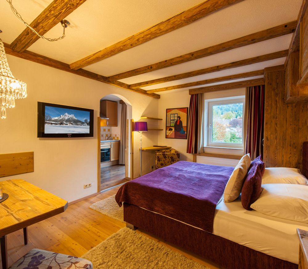 - Großer Wohnraum mit luxuriösem Bett, Esstisch für 2 Personen, Kabel-TV, Radio, Safe und Schreibtisch